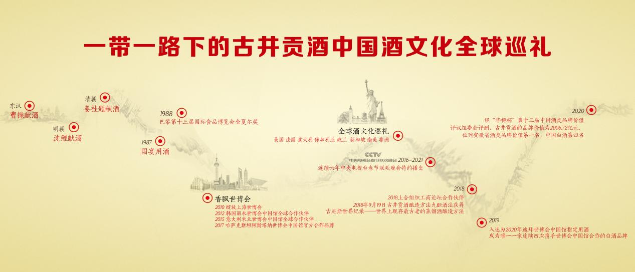 自2015年起,古井贡酒开展了“中国酒文化全球巡礼”活动,走进联合国总部、美国、法国、意大利、韩国等地,让世界人民品味到中国酿造的智慧。同时,连续多年联手世博会,将中国传统文化,传播到20多个国家和地区。一张亳州“中国酿世界香”的生动名片,以中国“酒神精神”,搭建了中国联通世界的桥梁。