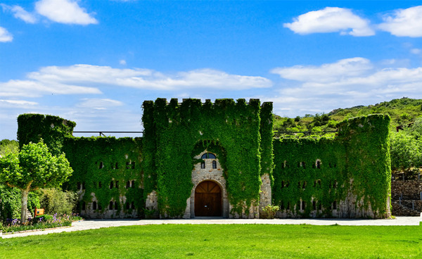 也许是门前引人注目的褐黄色石材大门,也可能是原木打造、做工精良的六角凉亭,又或是酒窖门口形似海豚再或霸下的天然奇石,它们依山而建,顺势自然,层层递进,中轴贯穿……