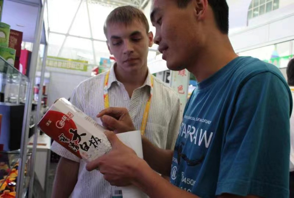 哈洽会上,工作人员正在向客商推介宝清大白板白瓜籽