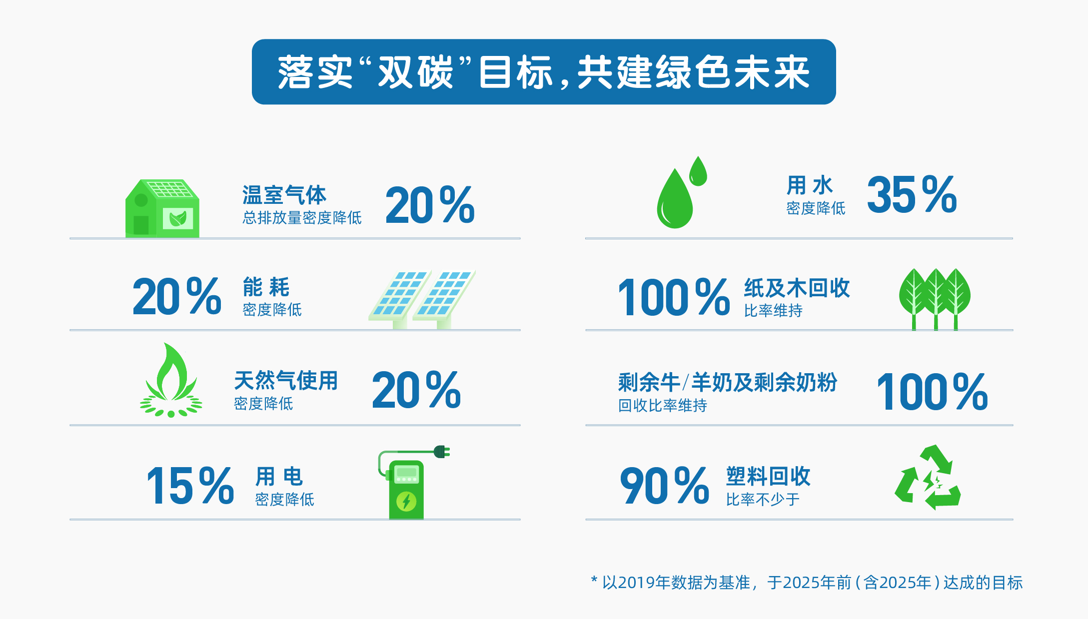 在成绩取得的同时,2021年澳优就温室气体排放、能耗、用水及废弃物回收制定循序渐进的目标,以改善和密切监察澳优的环境绩效。以2019年数据为基准,澳优计划于2025年前(含2025年)将公司温室气体总排放量密度降低20%,能耗密度降低20%,天然气使用密度降低20%,用电密度降低15%,用水密度降低35%,同时维持100%的纸及木回收比率,100%的剩余牛/羊奶及剩余奶粉回收比率,至少90%的塑料回收比率。