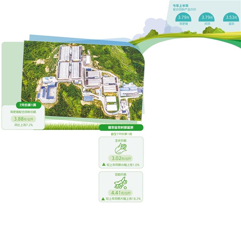 据农业农村部监测,截至7月份第1周,玉米和豆粕价格分别为3.02元/公斤和4.41元/公斤,玉米价格较上年同期小幅上涨1.0%,豆粕则大幅上涨18.2%。7月份第1周,以育肥猪配合饲料为例,价格为3.88元/公斤,同比上涨7.2%;玉米、豆粕以及育肥猪配合饲料分别较2022年第1周累计上涨5.0%、16.1%和6.0%,较2021年第1周上涨12.3%、23.9%和13.1%。