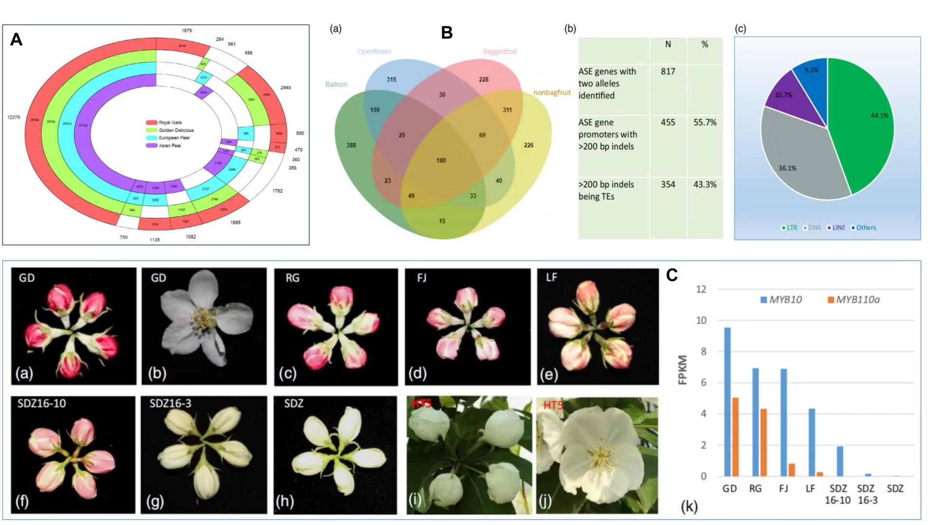 该研究以“嘎拉”苹果花培纯系为试验材料,完成了全基因组测序和组装;并进一步利用“皇家嘎拉”花和果实的转录组测序数据,在全基因组范围内鉴定到2091个等位基因特异性表达。将存在转座子的等位基因特异性表达基因序列进行分析,发现转座子插入影响了苹果花青素合成中两个重要调控基因的表达,进而影响了苹果花色。通过对231份苹果种质进行分析发现,两个关键基因上游区域的转座子插入与等位基因特异性表达和花青苷积累呈正相关,揭示了苹果花色演化的基础。