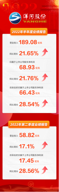 8月26日,洋河股份披露了2022年中报。报告显示,公司2022年上半年营业收入189.08亿元,同比增加21.65%;上半年归属于上市公司股东的净利润68.93亿元,同比增加21.76%;归属于上市公司股东的扣除非经常性损益的净利润66.43亿元,同比增长28.54%。