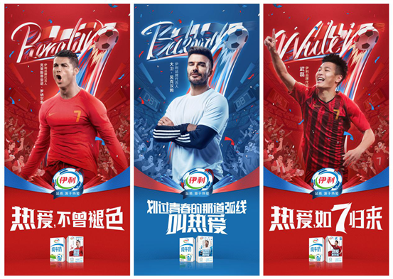 2022年9月15日,伊利正式官宣签约足球运动员克里斯蒂亚诺·罗纳尔多、大卫·贝克汉姆、武磊成为品牌代言人。值得注意的是,三位球员球衣号码同为7号,而这也是伊利在与阿根廷国家足球队、葡萄牙国家足球队、西班牙国家足球队达成战略合作之后,继续深入布局不同维度的足坛符号人物,以他们鲜明的个人标签与广泛影响力,诠释伊利与足球精神高度一致的热爱主张,再次引发球迷的高度关注。