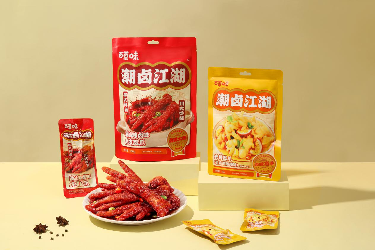潮汕鲜香、四川麻辣.....每个地方都有自己独特的餐饮口味,当把这些不同地域的餐饮口味融合在零食上,又将碰撞出怎样的火花?近日,国内休闲零食头部企业百草味推出了“潮卤江湖”系列卤味新品,该系列产品借鉴新派地方餐饮口味,围绕地域风味进行差异化创新,给消费者带来全新的味蕾体验。