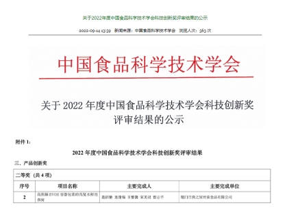 9月14日,中国食品科学技术学会网站公布了《关于2022年度中国食品科学技术学会科技创新奖评审结果的公示》,共计49项食品项目进入奖项名单。其中,燕之屋《高阻隔EVOH容器包装的高复水鲜泡燕窝》项目荣获2022年度中国食品科学技术学会科技创新奖——产品创新奖二等奖。