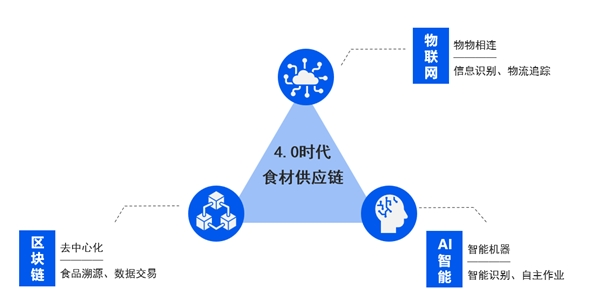 《白皮书》认为,在4.0时代食材供应链行业发展目标应该是基于“人”的赋能、组织进化、社会协同下产业链综合效率的提升。物联网、区块链、人工智能是4.0时代食材供应链最主要技术应用,虽然在3.0时代这些概念已成为热议,但仅技术发展而言仍处于早期初级阶段。4.0时代将是物联网、区块链、人工智能等技术持续成熟后与食材供应链行业的深度融合,通过可视化、可调节、可感知的方式颠覆新一代供应链。