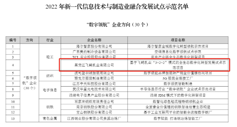 据了解,“数字领航”企业是国家今年新提出的称号,聚焦全要素、全流程、全生态数字化转型,目的是打造一批技术实力强、业务模式优、管理理念新、质量效益高的制造业数字化转型标杆。本次评选工信部围绕技术、业务、管理、成效四大方面综合评分,30家企业经过多轮严苛筛选成功入围,其中飞鹤是唯一的乳企。