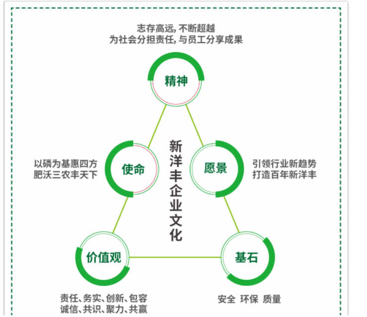使命源于追求,愿景与梦想相连。“以磷为基惠四方,肥沃三农丰天下”是新洋丰的全新使命,直指经营业务的核心,以磷资源为基础,继续做强磷复肥主业,更志在通过高品质的产品和服务,促进农民增产增收,助力乡村振兴,带动农民共同富裕,从而推动农业绿色发展,践行为“三农”服务的初心。同时又从可持续发展战略层面,积极探索和实现磷化工产业链的更大价值,在新能源材料、精细化工等领域大投入大发展,提升企业竞争力,最终为客户、员工、股东和社会带来更高回报。
