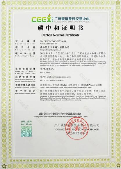 在应对气候变化、守护全球生态方面,蒙牛携手波士顿咨询公司,制定发布蒙牛双碳战略规划,明确提出将在2050年前实现全产业链碳中和(Net Zero),规划了涵盖生产、原奶、包装、运输、产品、碳抵消在内的15项具体举措。目前,蒙牛“双碳”战略成效显著,旗下曲靖工厂已率先实现碳中和,其绿色用电比例达到88.68%,尚志工厂也获得TÜV莱茵废弃物零填埋管理体系认证,成为乳制品行业首家实现废弃物零填埋管理的工厂。