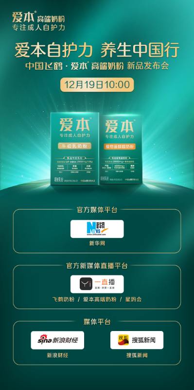 12月19日10:00时,“爱本自护力,养生中国行”——爱本高端奶粉新品发布会即将举行,两款爱本高端成人营养品也将重磅发布。届时,新华网客户端APP、搜狐新闻APP、新浪财经APP、飞鹤微博官方账号等平台将同步直播。