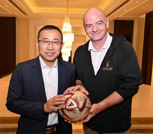 当地时间12月16日,蒙牛集团总裁卢敏放在卡塔尔多哈与国际足联(FIFA)主席因凡蒂诺举行会谈,双方针对2022年卡塔尔世界杯相关话题举行会晤,共同期待18日在卢塞尔球场举行的世界杯决赛。国际足联秘书长法特玛·萨穆拉、首席商务官罗米·盖、市场负责人尼克·布朗,蒙牛集团高级副总裁高飞、执行总裁李鹏程、副总裁温永平等参加本次会谈。