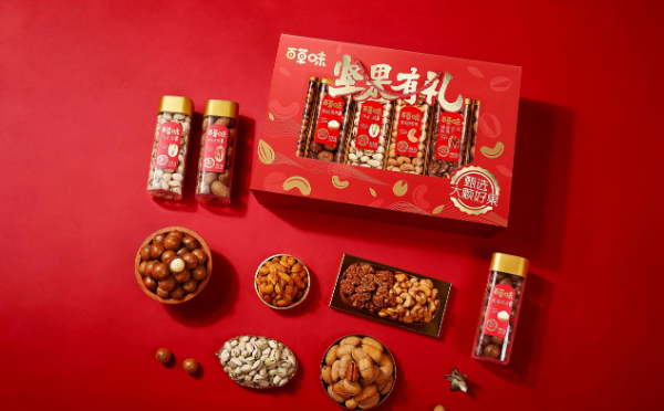 据悉,百草味在产品布局上以“年的味道”系列坚果礼盒为主导,主打过年场景,并联合国潮书艺术家朱敬一,推出联名款礼盒。同时,百草味还携手国家宝藏,打造IP联名系列国潮礼盒,并首次推出罐装坚果礼盒,组成年货礼盒矩阵,深度契合中国年的各式消费场景。