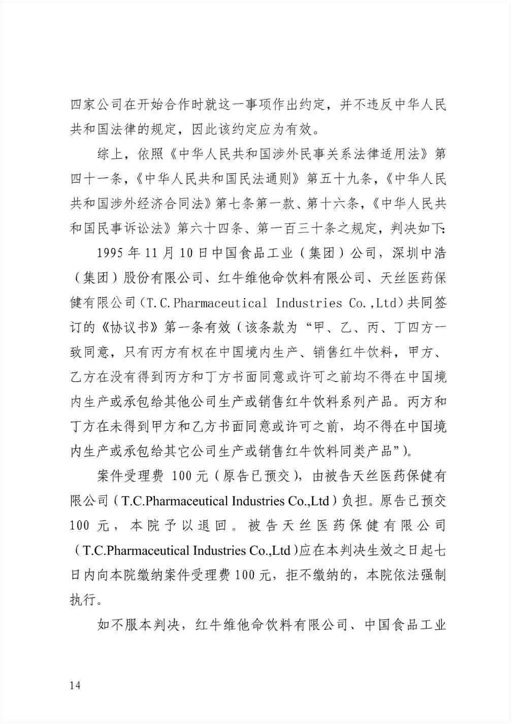 “依照《中华人民共和国涉外民事关系法律适用法》第四十一条,《中华人民共和国民法通则》第五十九条,《中华人民共和国涉外经济合同法》第七条第一款、第十六条,《中华人民共和国民事诉讼法》第六十四条、第一百三十条之规定,判决如下:1995 年 11 月 10 日中国食品工业(集团)公司、深圳中浩(集团)股份有限公司、红牛维他命饮料有限公司、天丝医药保健有限公司共同签订的《协议书》第一条有效(该条款为“甲、乙、丙、丁四方一致同意,只有丙方有权在中国境内生产、销售红牛饮料,甲方、乙方在没有得到丙方和丁方书面同意或许可之前均不得在中国境内生产或承包给其他公司生产或销售红牛饮料系列产品。丙方和丁方在未得到甲方和乙方书面同意或许可之前,均不得在中国境内生产或承包给其它公司生产或销售红牛饮料同类产品”)。