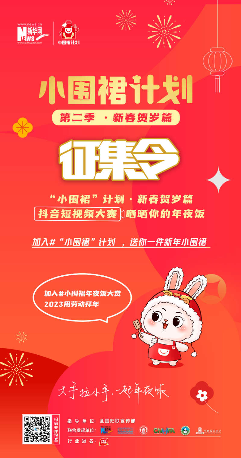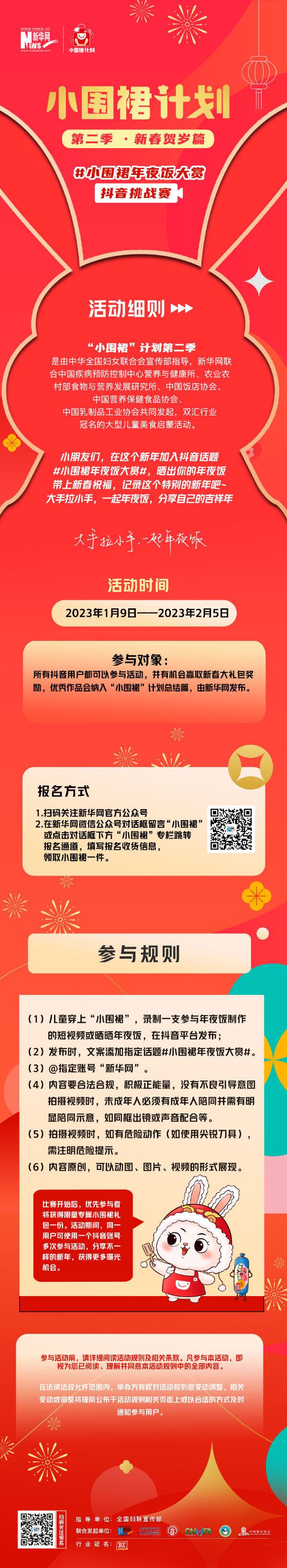 1月9日至2月5日参赛期间,参与者可通过抖音平台加入抖音话题#小围裙年夜饭大赏#,晒出年夜饭制作图文或视频,同时带上新春祝福,即可参赛。优胜者有机会赢取新春大礼包,优秀作品也会纳入“小围裙”计划总结篇,作为代表作品由新华网平台多渠道发布、广泛宣传。