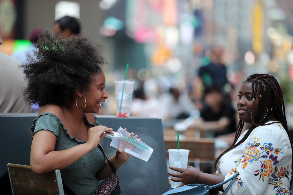 2018年7月2日,在美国纽约市时报广场,人们喝水休息。(新华社记者王迎摄)