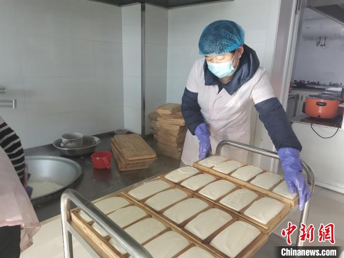 图为包金莲将熬好的奶豆腐放进木质模具中。 李娜 摄