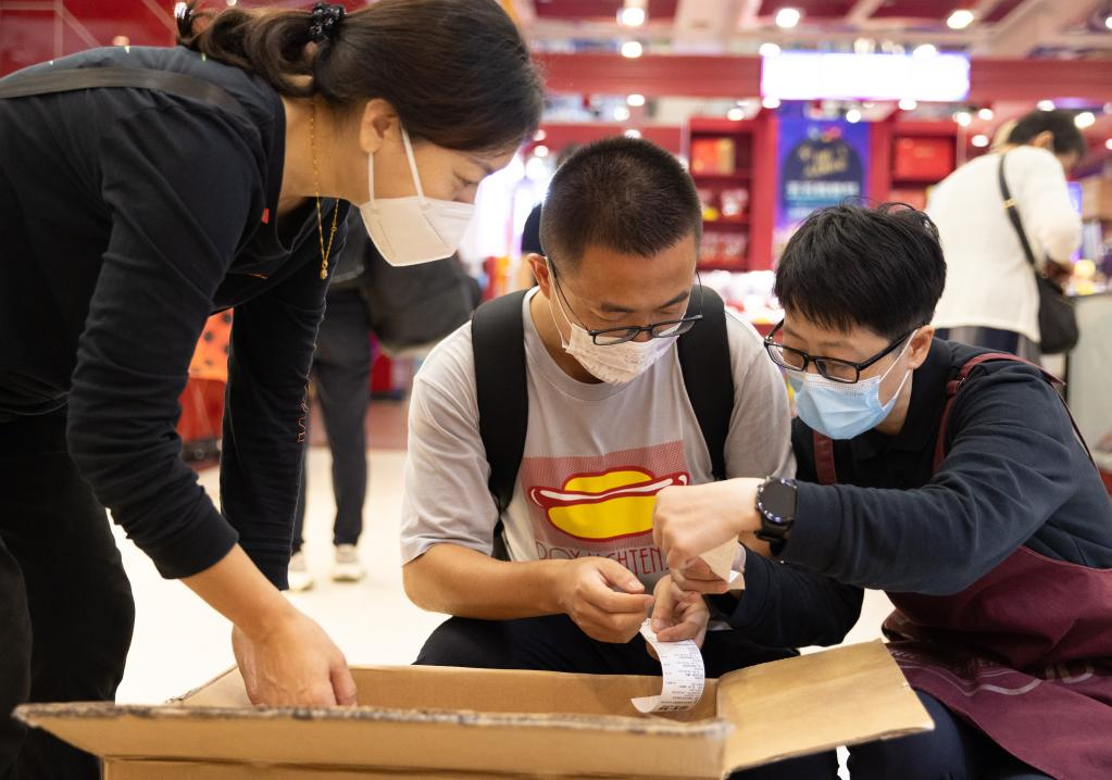郁非(右)在第一食品商店南京东路旗舰店和顾客一起核对购物清单(2022年9月23日摄)。新华社记者金立旺摄