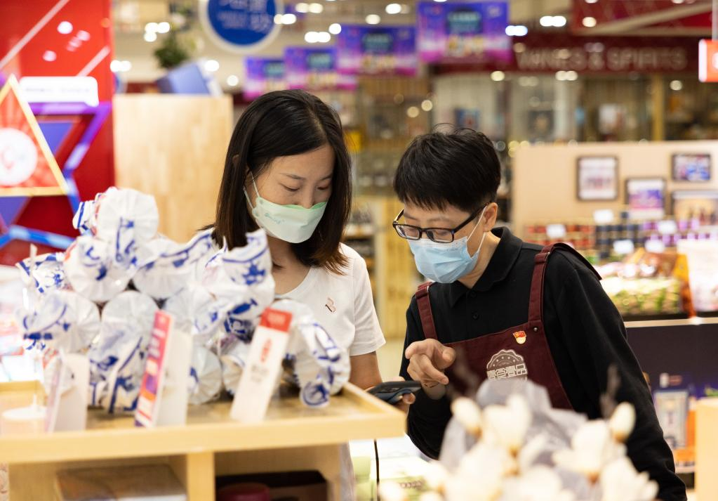 郁非(右)在第一食品商店南京东路旗舰店指导顾客购物(2022年9月23日摄)。新华社记者金立旺摄
