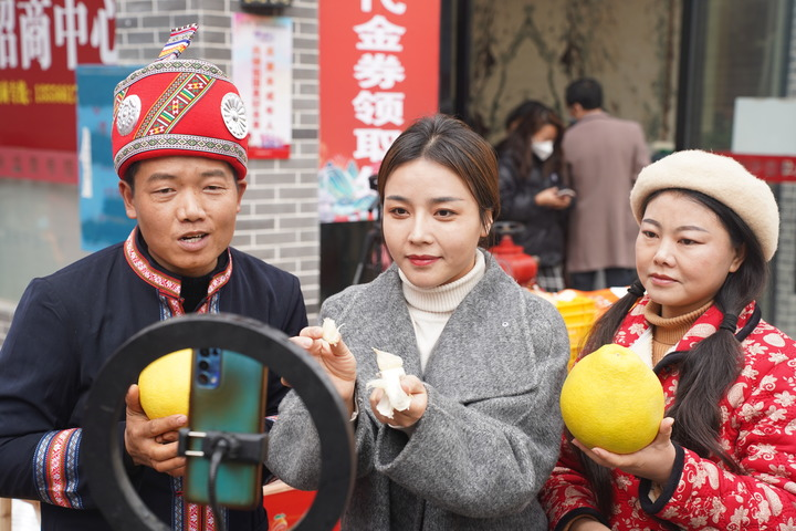 网上年货节期间,湖南江永香柚在直播间单场销售2万多单,这是一次直播现场。(受访者供图)