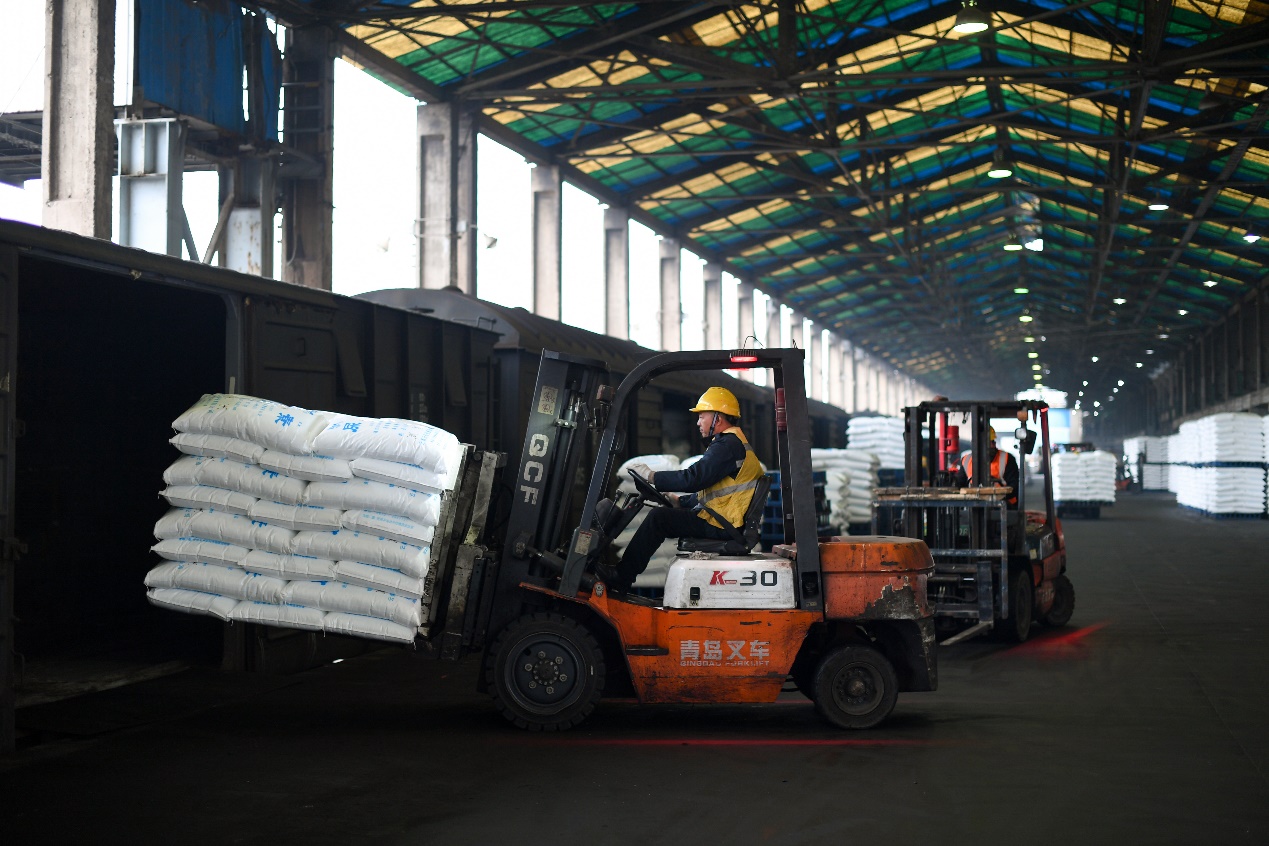 在云天化安宁物流园堆满化肥的成品库里,一辆辆叉车往返穿梭忙碌不停,将堆码在成品仓库的磷酸一铵、磷酸二铵送进车厢,这些满载着化肥的专列将从安宁物流园铁路专用线出发,把化肥运往全国各地。