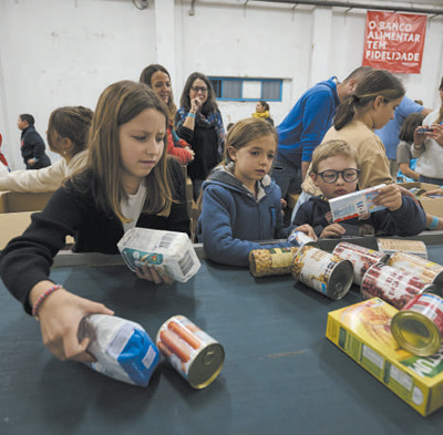 当地时间2022年11月26日,孩子们在葡萄牙里斯本的食品银行将食物进行分类。