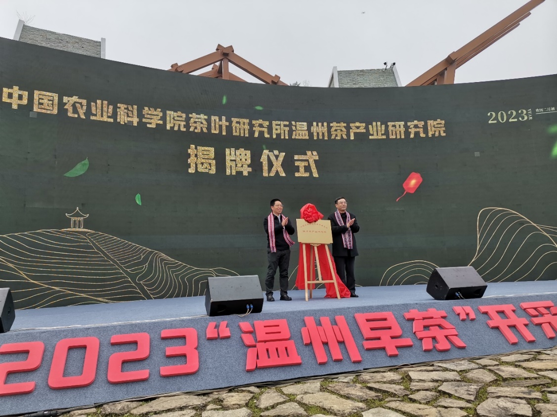 温州市农业农村局局长胡立左与中茶所所长姜仁华为“中国农业科学院茶叶研究所温州茶产业研究院”揭牌
