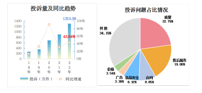 2022年,全国市场监管部门受理消费者投诉1310.38万件,同比增长43.84%,增速较2021年有所放大。从投诉问题看,质量298.70万件、售后服务248.96万件、合同115.91万件、食品安全109.06万件,合计占投诉的58.96%。其中,售后服务问题增长最快,群众反映最强烈,同比增长57.67%。