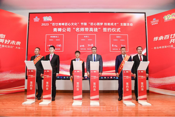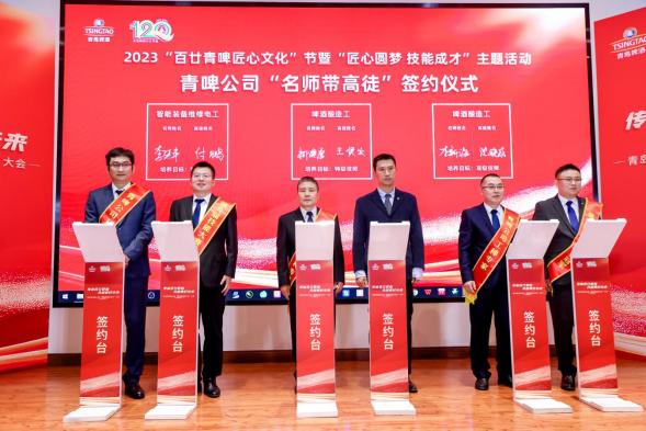 为匠心传承搭建快车道,推动全员质量提升进一步走深走实,青岛啤酒启动“名师带高徒”签约仪式,来自智能装备维修、酿造、包装、动力运行等多个工种的青岛啤酒特级技师、大工匠,签订师徒协议。