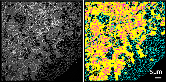 右图:ERnet分析图像后标记处不同部分的内质网结构,青色-管状内质网,黄色-片状内质网,紫色-片上管状内质网