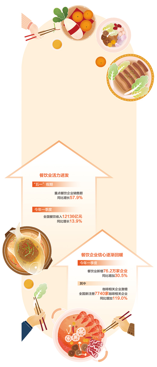餐饮业是促消费、惠民生、稳就业的重点领域。今年以来,餐饮消费一直呈现加快恢复向好态势,一季度全国餐饮收入同比增长13.9%,餐饮业新增企业数同比增加30.5%。餐饮业加快恢复向好、持续激发活力,为恢复和扩大消费提供有力支撑。