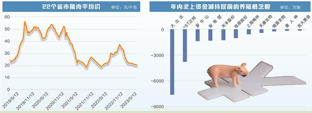 去年10月以来,猪肉价格再次冲高回落。以22个省市猪肉平均价看,截至5月12日,该平均价为20.23元/千克,相比2022年10月37.23元/千克的高点,已跌去45.66%。据国家发改委价格监测中心数据,截至5月10日当周,全国猪料比价为4.18,环比下降0.95%,按目前价格及成本推算出未来生猪养殖头均亏损为167.95元。
