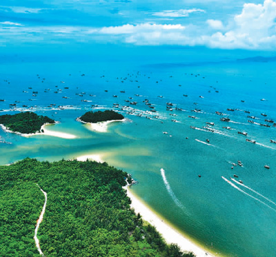 2022年7月26日,海南省三亚市凤凰岛海域,海天一色,风景如画,呈现一派千帆耕海的壮观画面。