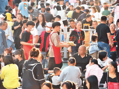 山东淄博烧烤火了,吸引了全国各地游客纷纷前来打卡。图为在淄博市张店区一家“网红”烧烤店,服务员正在给顾客上烤串。