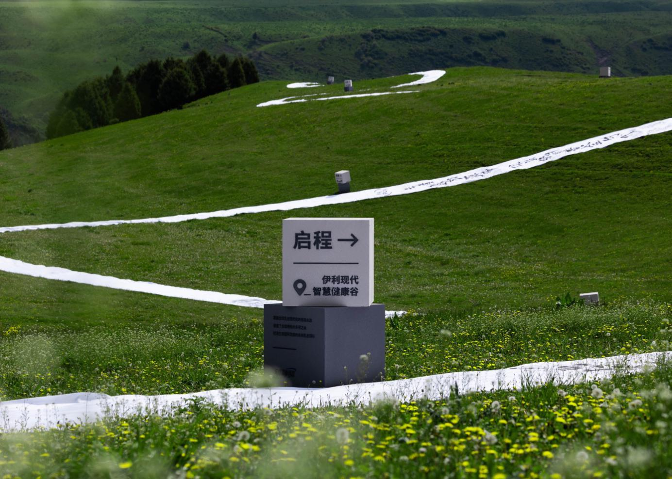 这条草原牛奶丝路的开端,是一只正在倾倒出“牛奶”的巨型奶盒,并从此处绵延出一条长约数公里的丝路,远看仿佛流淌的牛奶长河。而走近看会发现,丝路上的中国水墨画意勾勒出伊利的全球行踪,向着远方一路延伸。