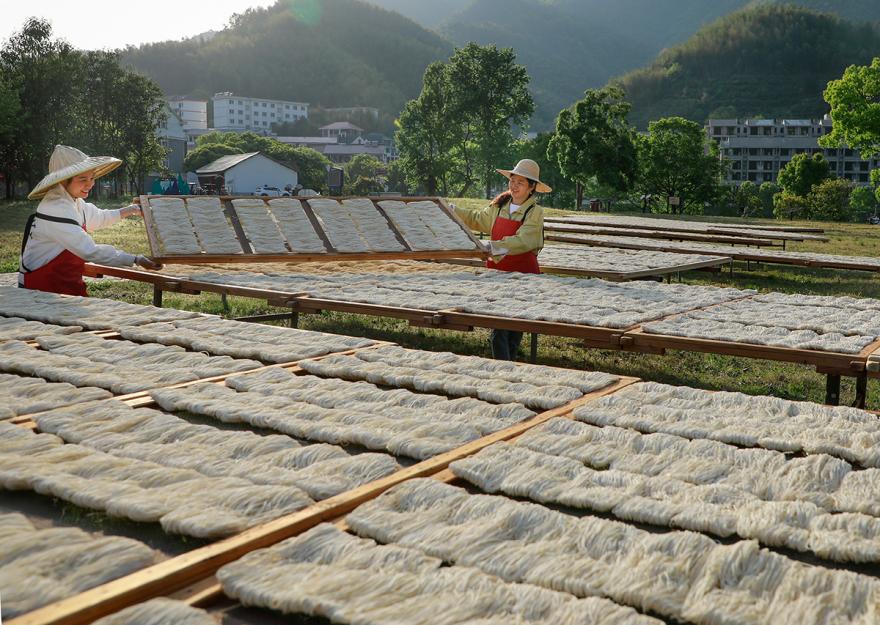 新乡贤王飞是杭州千岛湖口叭叭食品有限公司负责人,作为返乡创业的“先行军”,他积极投身日晒面产业发展,联合村党组织把废旧房屋改造成日晒面加工厂,实现剩余劳动力家门口就业。双西村直坑低收入家庭村民王卸梅每天早上照顾好久病的儿子后,步行几分钟就能到日晒面共富工坊上班,她说:“由于要照顾生病的儿子,一直不能外出打工,现在在家门口就能就业,还能兼顾小家,对我们来说生活工作都轻松不少,幸福感满满”。在乡贤能人的助力下,日晒面工坊已从2019年的8家,增加到今年的23家,今年年产值预计将达7000万元,带动村集体增收100万元。