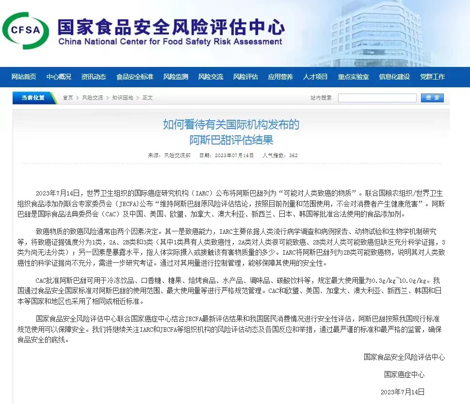 2023年7月14日,世界卫生组织的国际癌症研究机构(IARC)公布将阿斯巴甜列为“可能对人类致癌的物质”。联合国粮农组织/世界卫生组织食品添加剂联合专家委员会(JECFA)公布“维持阿斯巴甜原风险评估结论,按照目前剂量和范围使用,不会对消费者产生健康危害”。阿斯巴甜是国际食品法典委员会(CAC)及中国、美国、欧盟、加堂大、澳大利亚、新西兰、日本、韩国等批准合法使用的食品添加剂。