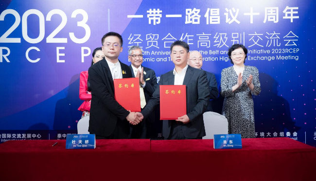 运鸿集团董事长吴东与泰中亚洲经贸协会秘书长杜天桥共同签署了战略合作备忘录,双方将在绿色碳中和、全生物降解、绿色可持续发展等领域,全方位开展交流互鉴,助力中泰经济高质量发展。