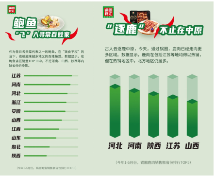 同时,《报告》显示,一些昔日的小众食材也进入了更大区域,如鹿肉在除河北、河南、陕西等北方区域热销外,江苏也名列省区销量榜前五。