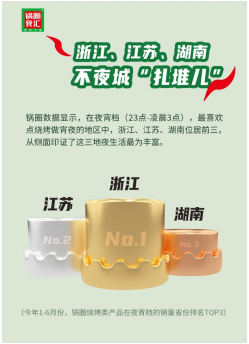 此外,《报告》还发现,在夜宵档 (23点-凌晨3点),最喜欢点烧烤做宵夜的地区中,浙江、江苏、湖南位居前三。鉴于烧烤明显的社交属性,上述数据从侧面印证了这三地夜生活最为丰富。