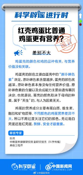 鸡蛋壳的颜色与营养价值无关联。鸡蛋壳的颜色主要由蛋壳中的“原卟啉色素”决定,原卟啉色素含量越多,蛋壳的颜色就越深。原卟啉色素本身没有任何营养价值,原卟啉色素的含量以及合成能力主要由遗传基因决定,也就是说,蛋壳的颜色取决于母鸡的种类,属于“天生”。