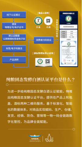 为进一步给纯粮固态发酵白酒认证赋能,特推出纯粮固态发酵认证平台,提供在产品上附瓶盖、酒标两种二维码服务,基于标准化、智能化的数据体系,对商品实现赋码、生产、仓储、发货、经销、防伪、营销等一物一码全链路数字化管控,同时有区块链平台支撑,基于微信平台灵活的交互形式,为品牌防伪、产品溯源、数字化营销全面赋能。