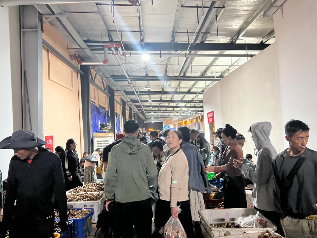 晚上11时,记者走进当地松茸交易市场,看到客商云集,门店前满是用松茸堆成的小山。虽已入夜,市场内人声鼎沸,商户达瓦央宗热情地拉住记者,推销自家采摘的松茸。询问得知,这段时间,她和家人每天凌晨3点半摸黑出门,沿着山道来到家附近的青杠林采摘新鲜松茸,然后来市场交易,有时一忙就要持续到深夜。“一个松茸季下来,家里能增加五六万元的收入。”