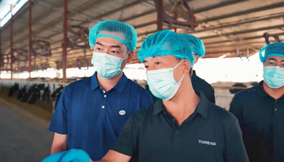 质量管理人员一起巡视牛舍,观察奶牛健康状况