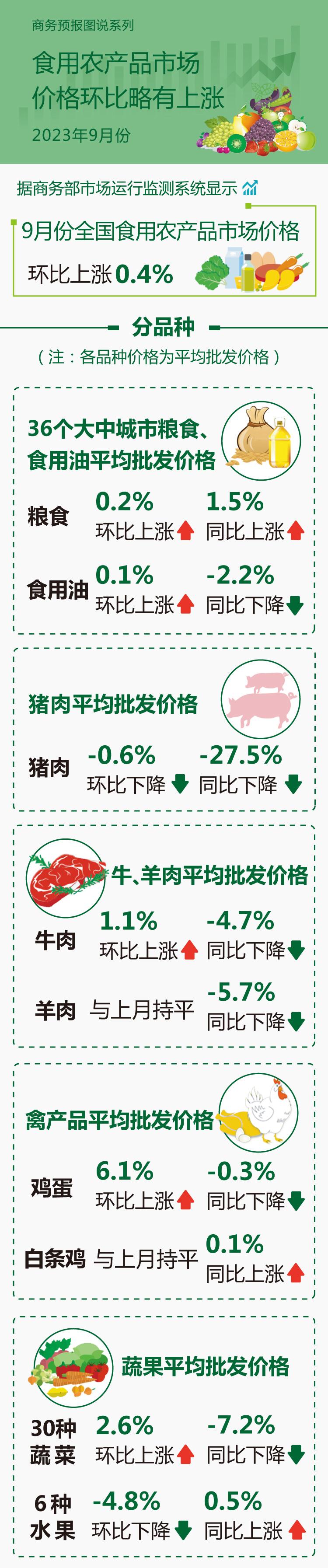 据商务部市场运行监测系统显示,9月份全国食用农产品市场价格环比上涨0.4%,