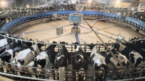 图片为泌乳奶牛在利拉伐挤奶转盘上挤奶