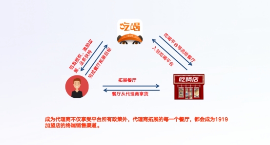 除了提供强大的供应链服务,1919吃喝店还有多重优势,让餐厅经营无忧。首先,1919吃喝店是在餐厅内开设的店中店,有效利用餐厅“闲置空间”,也无需增加额外场地费、人工费。同时,加盟1919吃喝店,将免费共享1919线上线下全渠道资源,实现“线上+到店”双收益。1919吃喝店通过重塑传统餐饮行业“人货场”,整体降低餐厅运营成本的同时,让酒水利润重回餐厅,帮助餐厅突破发展瓶颈,提升行业竞争力。