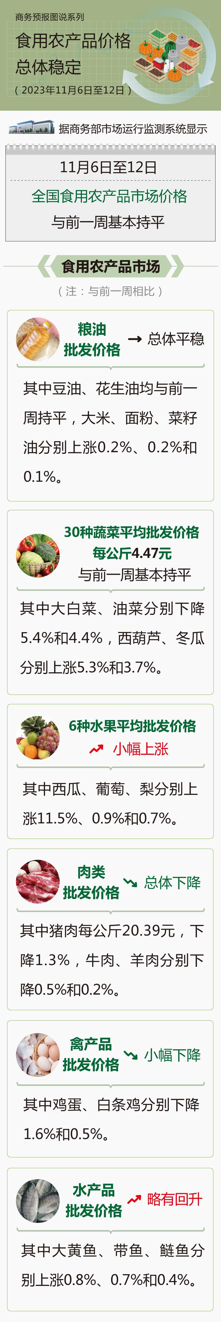 据商务部市场运行监测系统显示,11月6日至12日,全国食用农产品市场价格与前一周(环比,下同)基本持平。