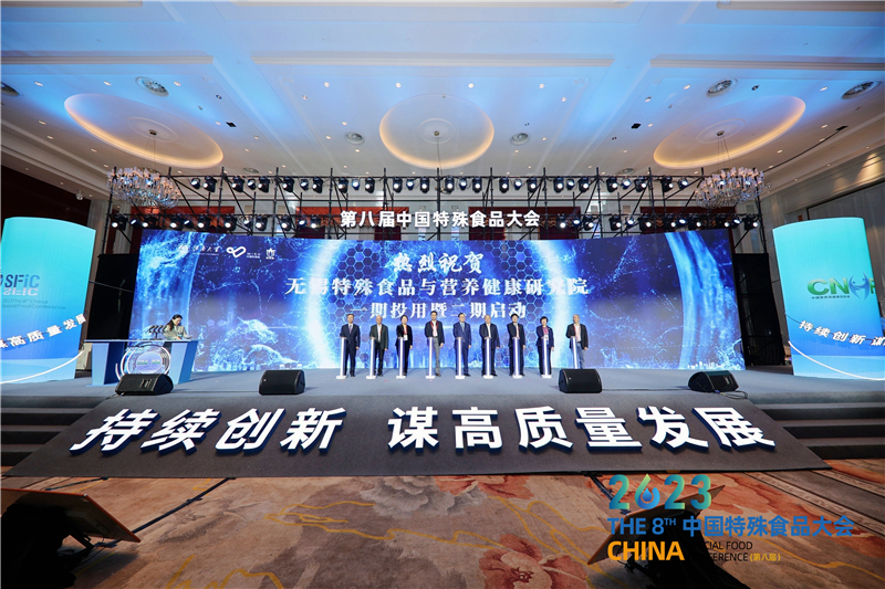 随后,举办了无锡特殊食品与营养健康研究院投用仪式。中国营养保健食品协会会长边振甲,中国工程院院士谢明勇,国家食品安全风险评估中心主任李宁,原黑龙江省食品药品监督管理局正厅级巡视员/常务副局长、教授/博导张守文,中国营养保健食品协会副会长、首都医科大学附属北京世纪坛医院教授石汉平,中国营养保健食品协会副会长、东北农业大学食品学院院长姜毓君,四川大学华西公共卫生学院教授张立实,国家功能食品工程技术研究中心常务副主任徐学明,江南大学国家功能食品工程技术研究中心教授李雅慧一起上台,为无锡特殊食品与营养健康研究院投用揭幕。