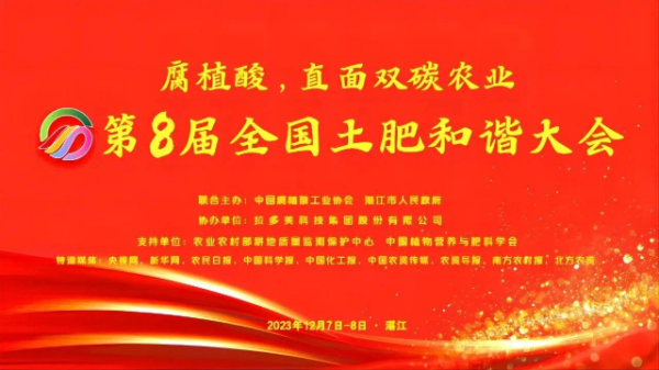 12月7日至8日,“第八届全国土肥和谐大会”在广东湛江召开。本届大会由中国腐植酸工业协会和湛江市人民政府共同主办,农业农村部耕地质量监测保护中心、中国植物营养与肥料学会和广东省农业农村厅等单位支持,拉多美科技集团股份有限公司协办。大会围绕“腐植酸,直面双碳农业”主题,16场学术报告,500多位代表,共筑“土肥和谐”命运共同体,明确了新时期黑色腐植酸、腐植酸肥料开展“双碳农业”的历史使命。